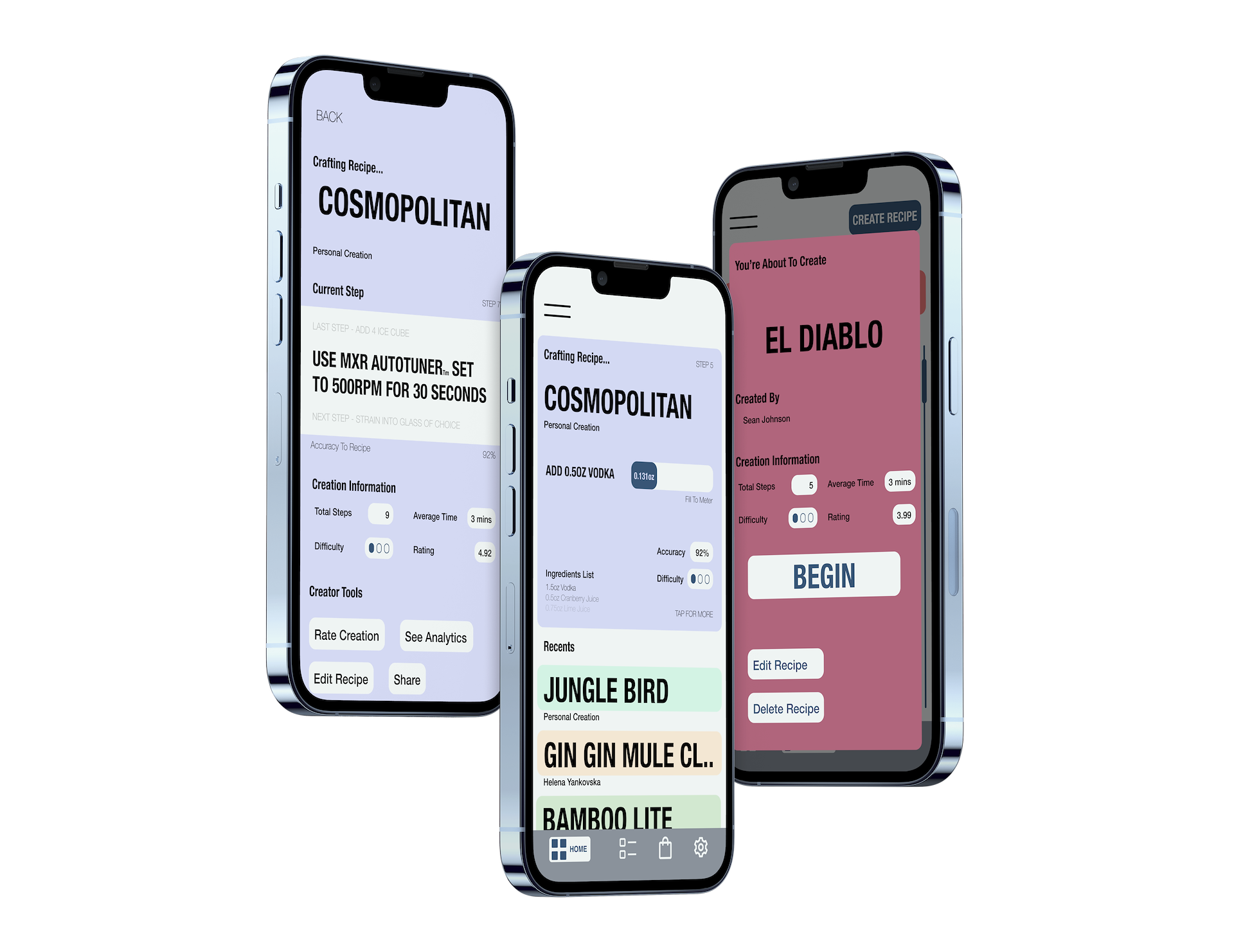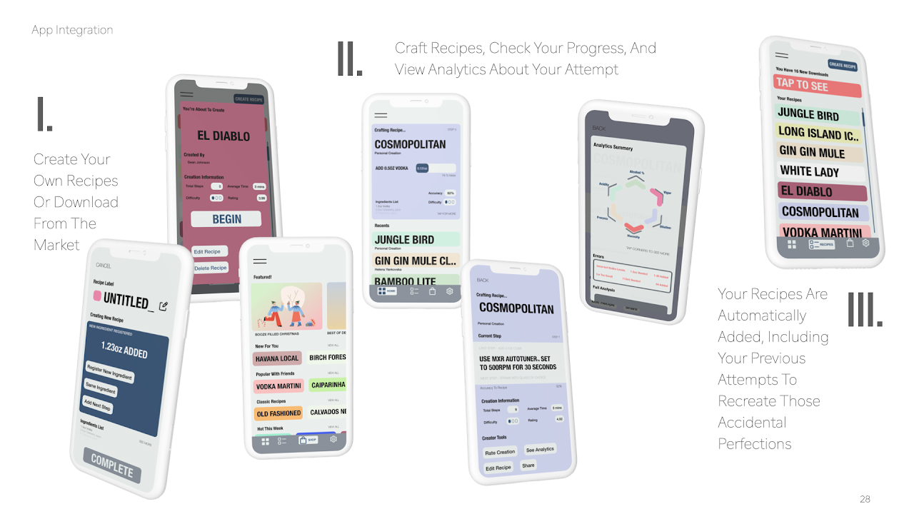 MY DESIGNS MAKES AMBITIOUSNESS A BREEZE. A USER EXPERIENCE ISN’T LIMITED TO THE SCREENS WE INTERACT WITH. MXR IS AN ALL IN ONE PRODUCT, USING YOUR PHONE TO ENHANCE THE MIXOLOGY CREATIVE PROCESS. BY LEVERAGING THE DIGITAL BOND WE HAVE WITH OUR PHONES, MXR IS AN INTUITIVE TOOL THAT IMPROVES THE TRADITIONAL MIXOLOGY PROCESS: REMOVING THE GUESS WORK, AND TRIALS AND ERRORS.
